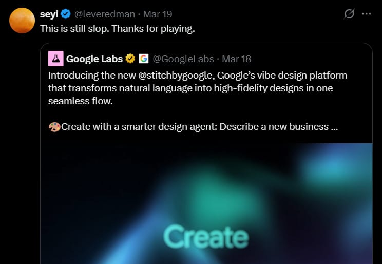 Those who hate it say that Stitch still produces the same “AI slop” that we have all been accustomed to hate (purple gradient, weird fonts, uncropped images).